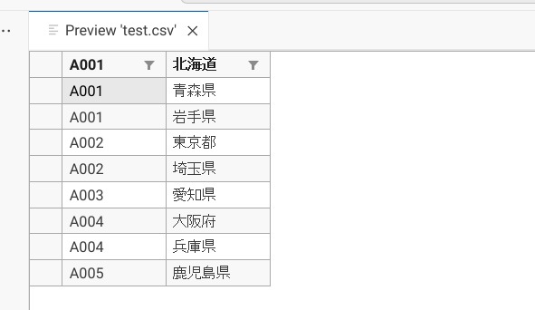 // [ 'A002,東京都', 'A002,埼玉県', 'A004,大阪府', 'A004,兵庫県' ]