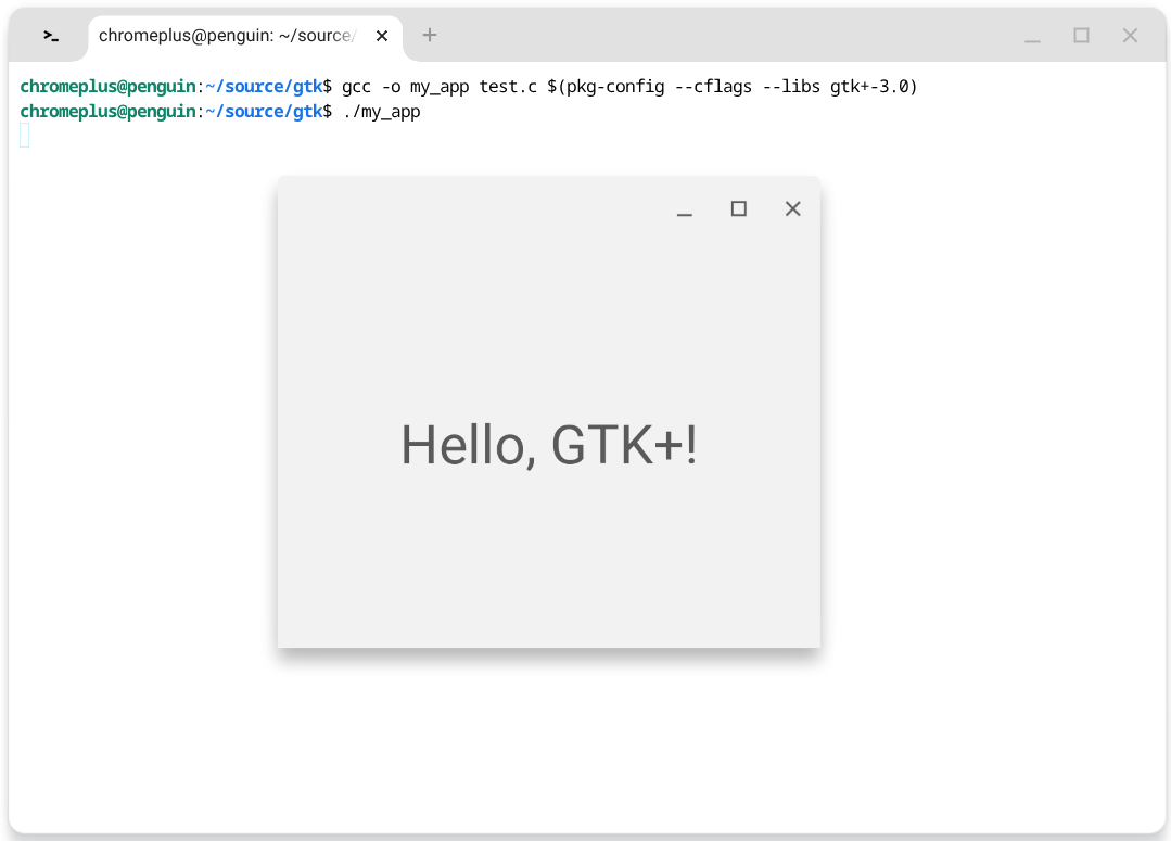 作成したGtk+アプリケーションは、Linux環境でコンパイルし、実行することでChromebook上にGUIウィンドウとして表示されます。シンプルなコードでも、デスクトップアプリケーションとして機能する様子を確認できます。