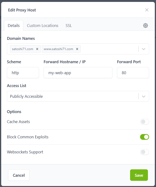 コンテナが立ち上がったら、NPMの管理画面で Forward Hostname をコンテナ名(my-web-app)に設定し、ポートを 80 にします。設定を一度「Save」し直すことが、502エラーを回避するコツです。