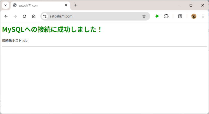 ブラウザで https://satoshi71.com にアクセスし、「MySQLへの接続に成功しました!」というメッセージが表示されれば、インフラ構築はすべて完了です。