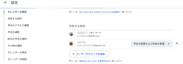 - 「ユーザーやグループの追加」をクリックし、共有したいメールアドレス(自分)を入力し、権限を「予定の変更」または「予定の変更および共有の管理」を選択してください。「閲覧権限」だけではGASから書き込みができません。