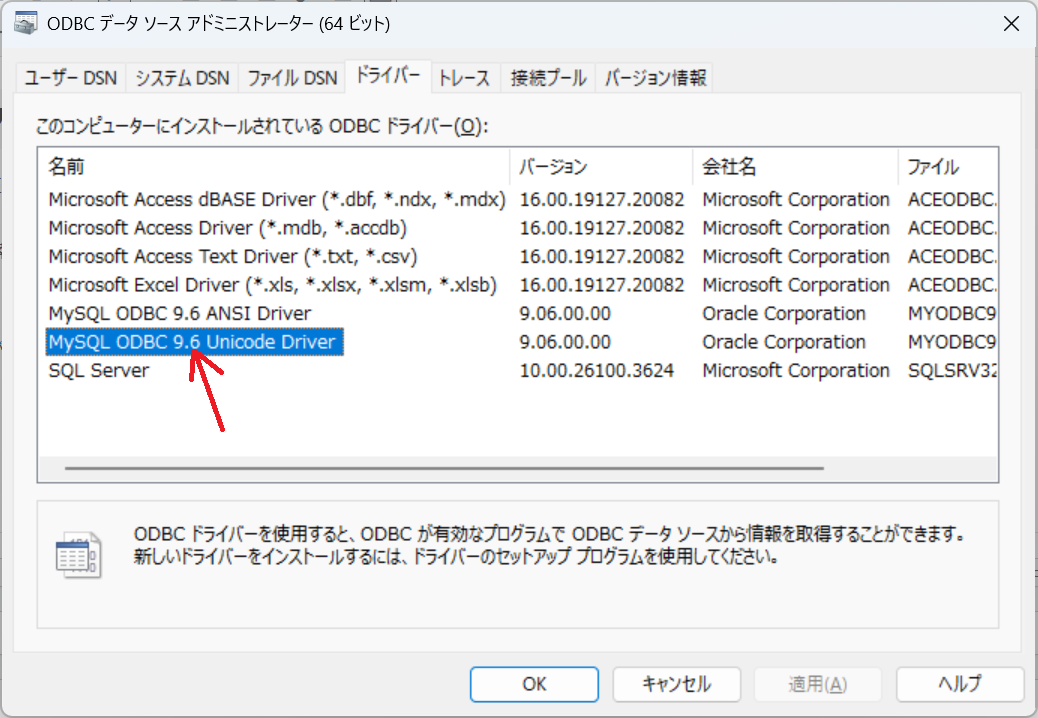 - MySQL ODBC 9.6 Unicode Driver など、表示されている文字列をメモします。